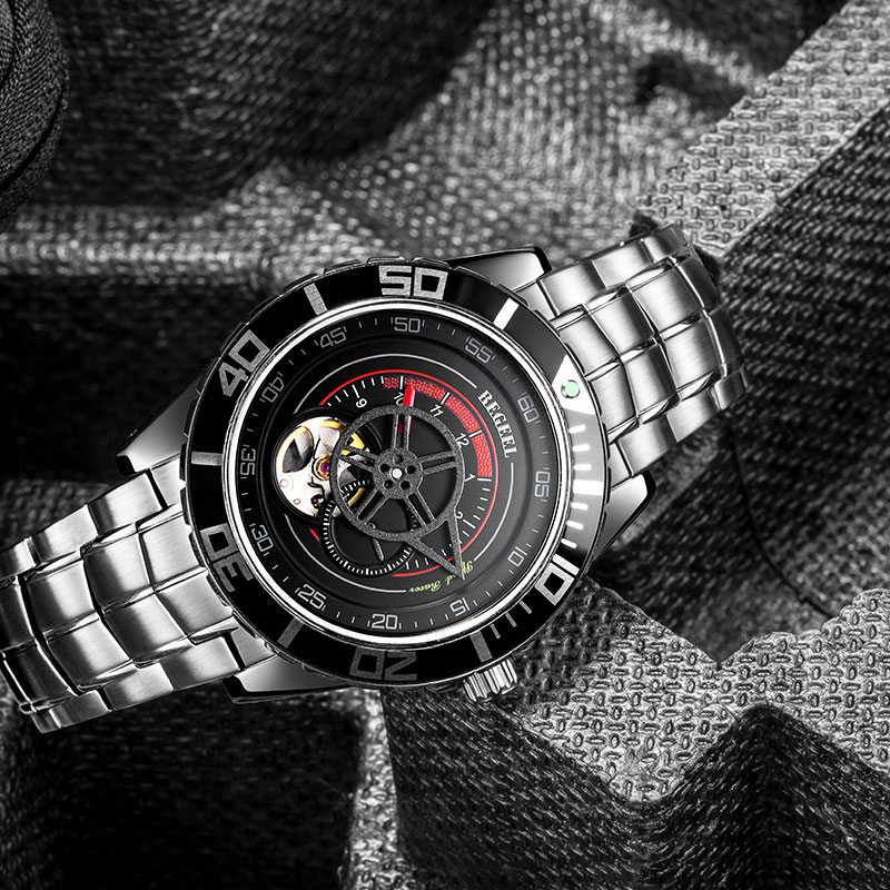 賓爵經典賽車系列又一力作,專為潮人設計。設計師將F1賽車的經典元素融入腕表設計,粗獷剛毅的線條,顛覆式時間顯示,融合現代撞色藝術,打造出這款時尚前衛的型男腕表。表盤跳脫出傳統的大三針,黑色三角齒輪式分針和60分鐘刻度圈以賽車輪輞和輪胎為靈感來源,4點位黑色小秒盤以賽車時速盤為原型,時針表盤設計源自賽車轉速盤,三層立體構造,指針形態各異,炫酷設計,彰顯時尚個性。