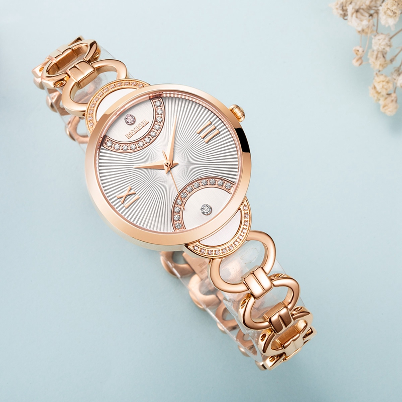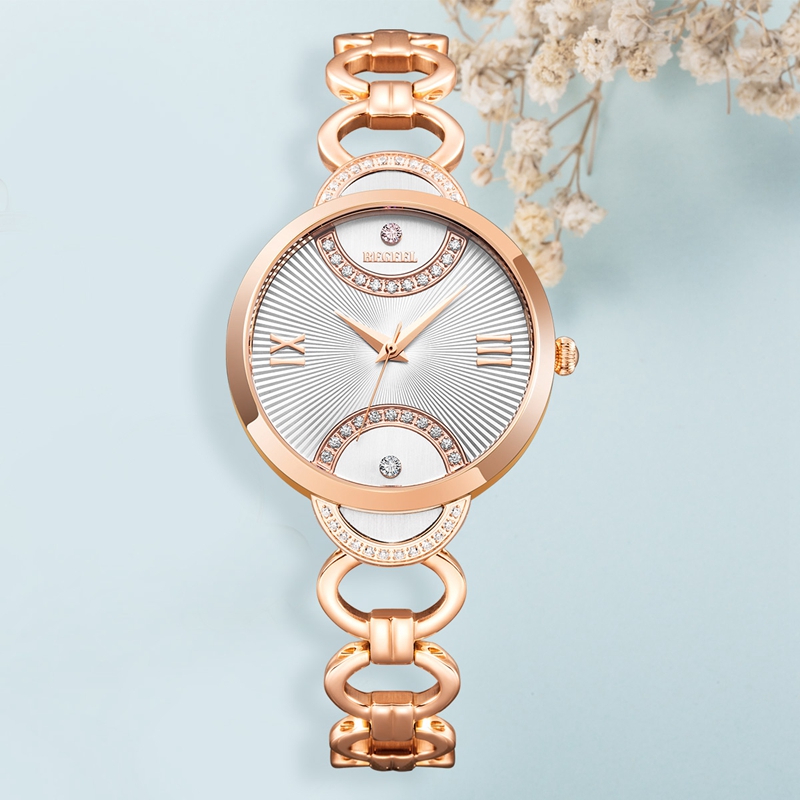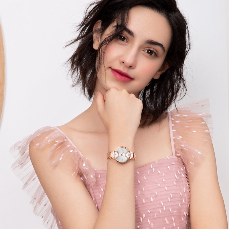 表殼:316L鋼/電鍍玫瑰金 耳位鑲12+12顆水鉆,跟字面結合成圓形