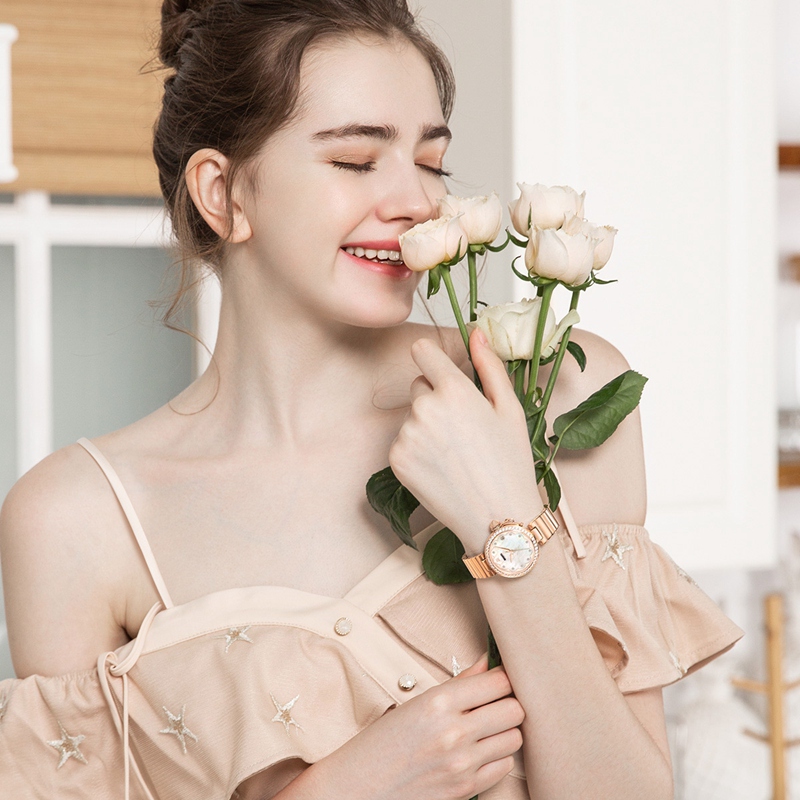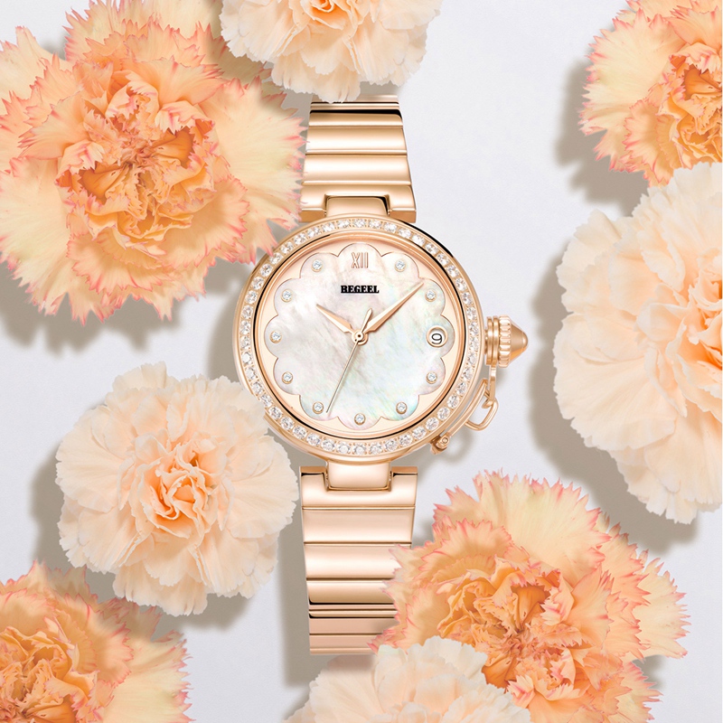 本款的字面設(shè)計(jì)取自“花朵盛開(kāi)在太陽(yáng)初升時(shí)”的場(chǎng)景,外部一圈形似花瓣的輪廓,以珍珠母貝為底,幻彩的貝面反射光線(xiàn),就像一朵盛開(kāi)的嬌艷鮮花在朝陽(yáng)初升的迷朦霧氣中,若隱若現(xiàn);10顆水鉆作為時(shí)間刻度顯示,就像花瓣上晶瑩的露珠,折射出耀眼的光澤。旭日東升,花開(kāi)幾朵,象征著一天美好的生活