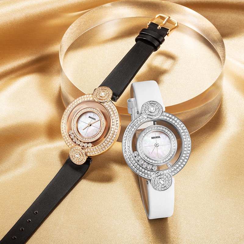 以簡約的線條展示清麗典雅的設計風格,象征繆斯女神的自信與光芒。表盤采用了特有的“鏤空”設計,較小的同心圓為珍珠母貝質地,呈圓滿的球型。兩個同心圓環皆為拋光打造。 兩個圓環之間、藍寶石水晶鏡面的無形護佑下,七顆靈動水晶鉆如懸空漂浮一般,在流光溢彩的閃爍光華中無盡地回旋、轉動。表殼的頂端與底端各綴有一粒單顆水晶鉆,使表殼到豐盈的黑、白色表帶之間的過渡呈現出簡潔、雋永的顯著風格。