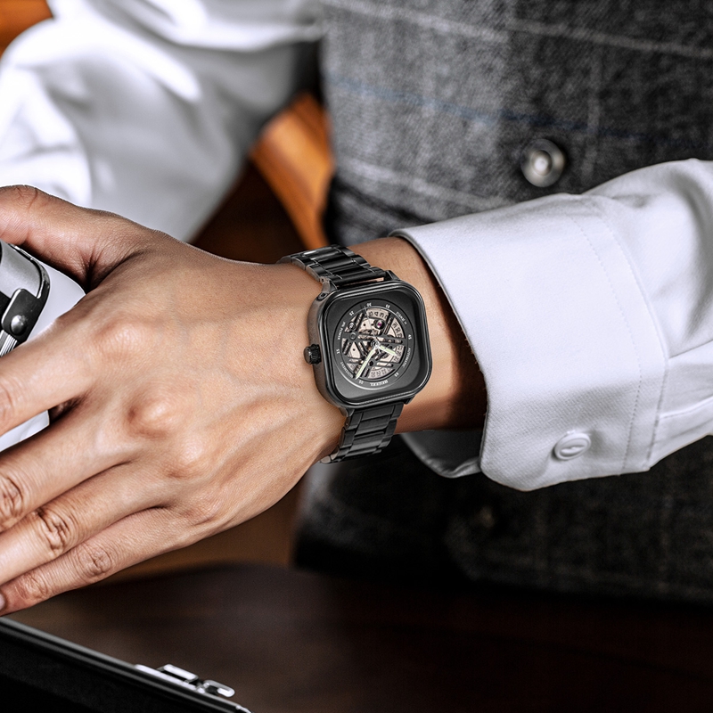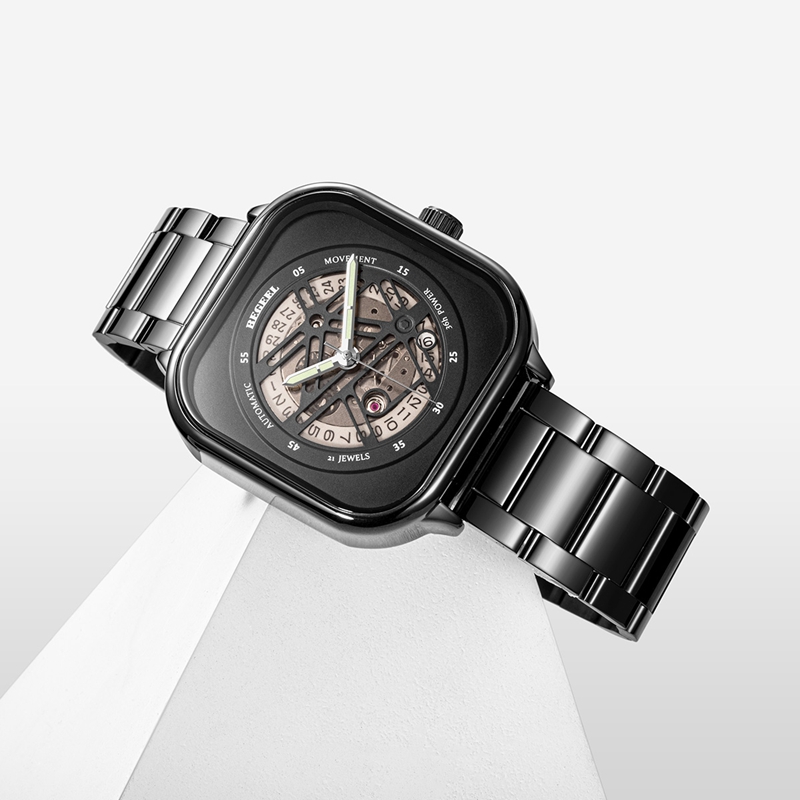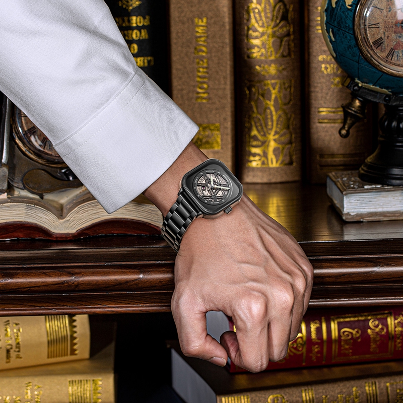 以暗夜中急行軍令的武士為設(shè)計靈感,將黑夜的神秘未知與精致鏤空的機(jī)械設(shè)計融為一體,盤根交錯的鏤空結(jié)構(gòu)勾勒出鐵甲武士的行動軌跡,在以外方內(nèi)圓的別致設(shè)計,在沿襲傳統(tǒng)工藝美學(xué)的同時,大膽呈現(xiàn)品牌別具一格的不凡品味。雙面鏤空與全景背透,和您一起揭開武士的神秘面紗。