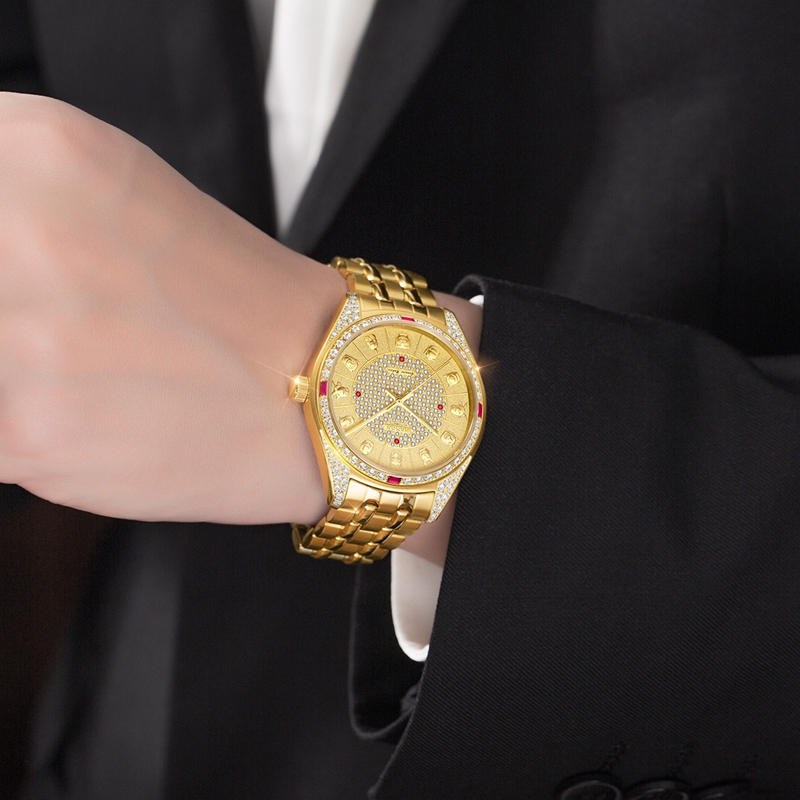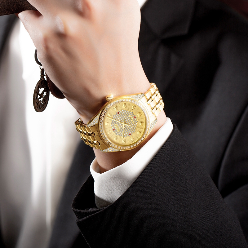 字面:鑲4顆真紅寶石,磨砂金面,刻度位雕刻12生肖電鍍真金,夜光指針,鑲約173顆晶鉆