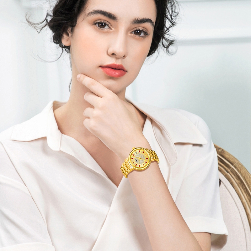 字面:鑲3顆真紅寶石,金色太陽紋,8顆馬眼合成紅寶石,約197顆晶鉆,6、9、12真釘馬眼托,夜光針