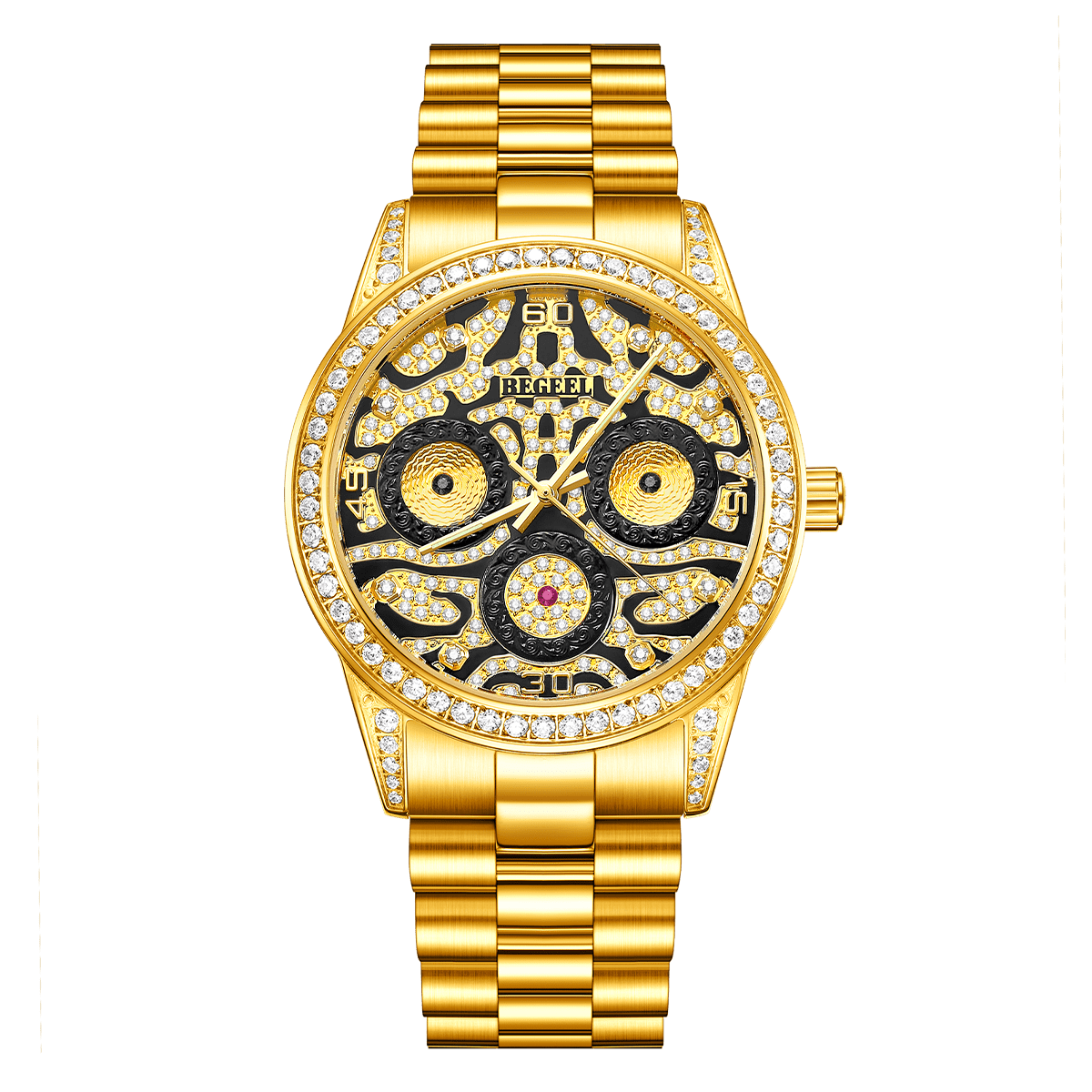 字面:8顆真鉆石,鏤空放射式紋字面,真釘logo, 3 6 9 12位真釘刻度,強(qiáng)夜光