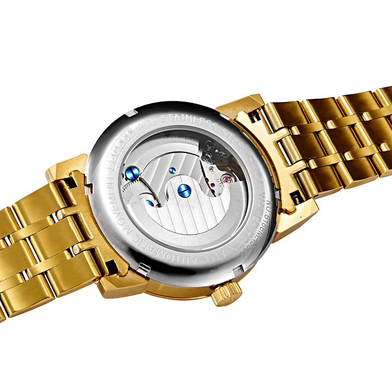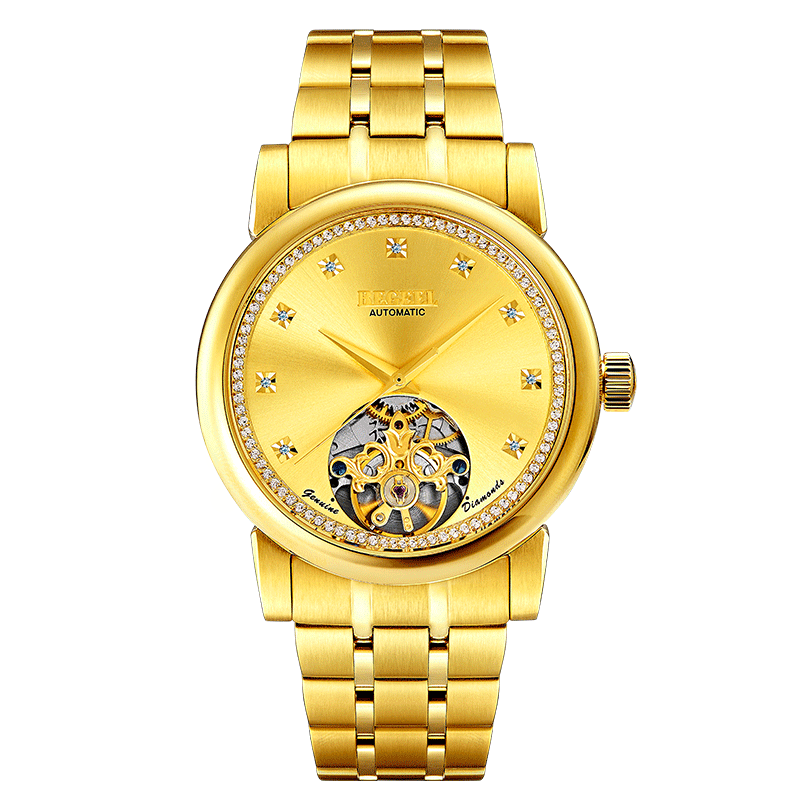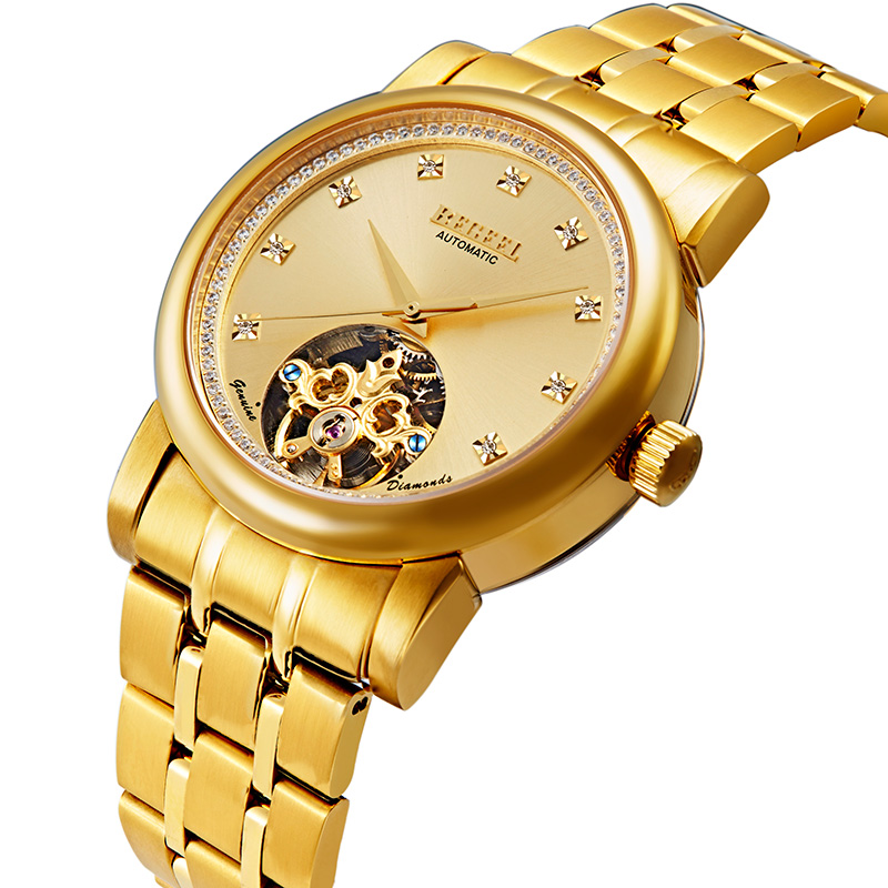 太陽紋表盤,細膩打磨的太陽紋表盤,紋路細膩有光澤,從任何角度都能釋放出耀眼的太陽光芒,時刻吸引他人注目。9顆天然真鉆鑲嵌于時標鉆托之上,釋放耀眼光芒,明證時間的彌足珍貴。6點位開窗設計,可清晰地欣賞機芯游絲的飛速運轉,完美呈現機芯的精華部分,正面感受機械運轉的力量感。